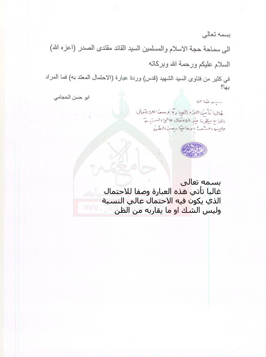 معنى عبارة(الاحتمال المعتدبه)في كثير من فتاوى السيد الشهيد(قد)(استفتاء للسيد القائد بتاريخ3-8-2011)