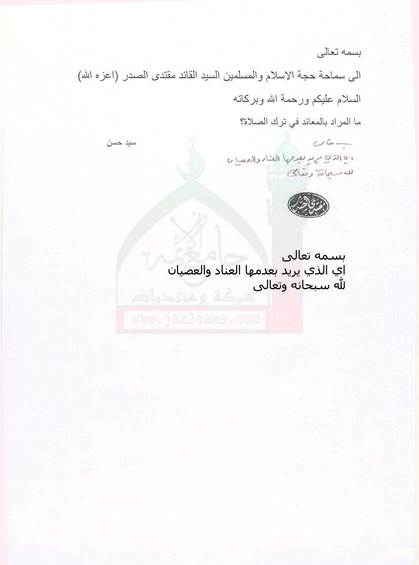 المراد من المعاند في ترك الصلاة(استفتاء للسيد القائد بتاريخ6-8-2011)