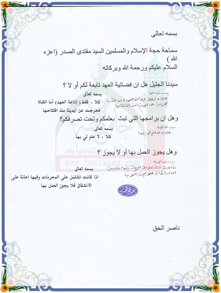 استفتاء للسيد القائد مقتدى الصدر حول برامج فضائية العهد وامكانية العمل بها بتاريخ 10-12-2010