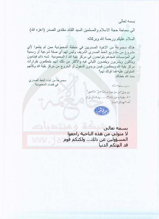 مركز بقية الله الثقافي-المحمودية(استفتاء للسيد القائد مقتدى الصدر اعزه الله بتاريخ10-8-2011)
