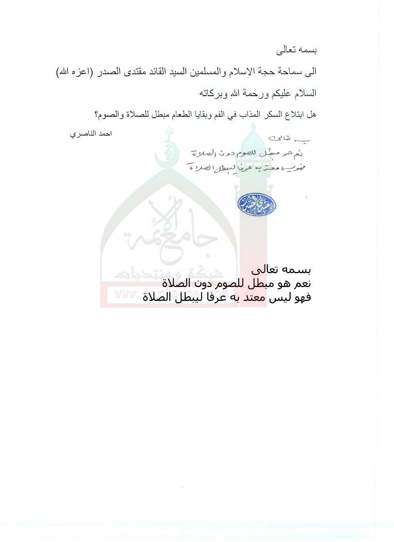 ابتلاع السكر المذاب في الفم وبقايا الطعام مبطل للصوم دون الصلاة(استفتاء للسيد القائد مقتدى الصدر اعزه الله بتاريخ11-8-2011)