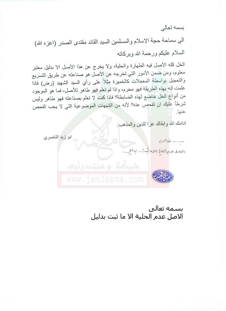 الاصل في الخل عدم الحلية الا ما ثبت بدليل(استفتاء للسيد القائد مقتدى الصدر اعزه الله بتاريخ11-8-2011)