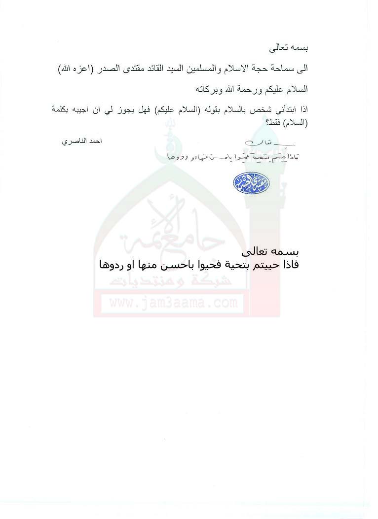 اذا حييتم بتحية فحيوا باحسن منها او ردوها(استفتاء للسيد القائد مقتدى الصدر اعزه الله بتاريخ11-8-2011)