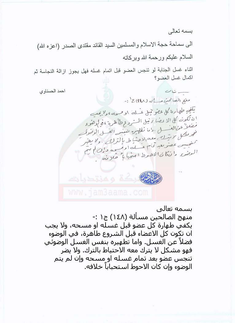 يكفي طهارة كل عضو قبل غسله او مسحه,ولا يجب ان تكون كل الاعضاء قبل الشروع طاهرة(استفتاء للسيد القائد مقتدى الصدر اعزه الله بتاريخ11-8-2011)