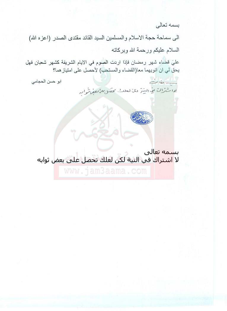 لا اشتراك في النية لمن اراد صوم قضاء شهر رمضان في شعبان لكن لعلك تحصل على بعض ثوابه(استفتاء للسيد القائد مقتدى الصدر اعزه الله بتاريخ11-8-2011)