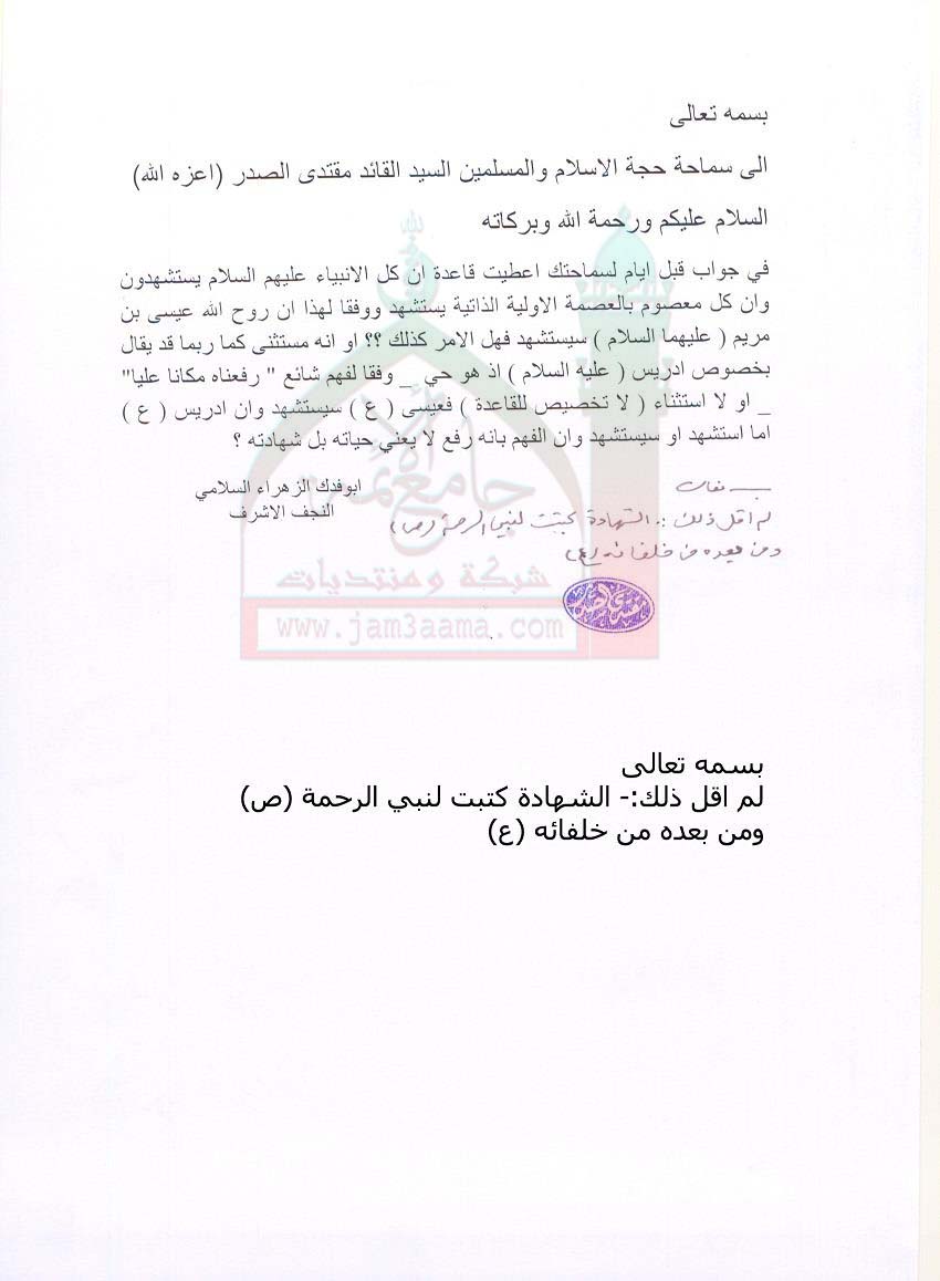 الشهادة كتبت لنبي الرحمة(ص) ومن بعده من خلفائه(استفتاء للسيد القائد مقتدى الصدر اعزه الله بتاريخ11-8-2011)