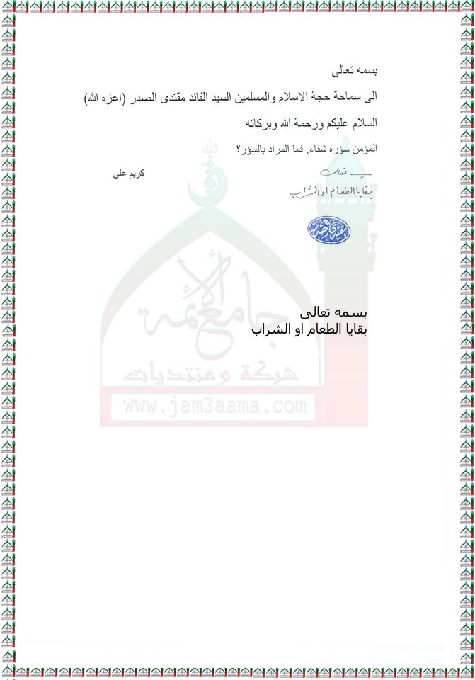 سؤر المؤمن:بقايا طعامه وشرابه(استفتاء للسيد القائد مقتدى الصدر اعزه الله بتاريخ11-8-2011)