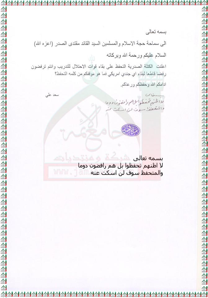 لا اظن ان الكتلة الصدرية قد تحفظت على بقاء قوات الاحتلال للتدريب بل هم رافضون دوما,والمتحفظ سوف لن اسكت عنه(استفتاء للسيد القائد مقتدى الصدر اعزه الله بتاريخ11-8-2011)
