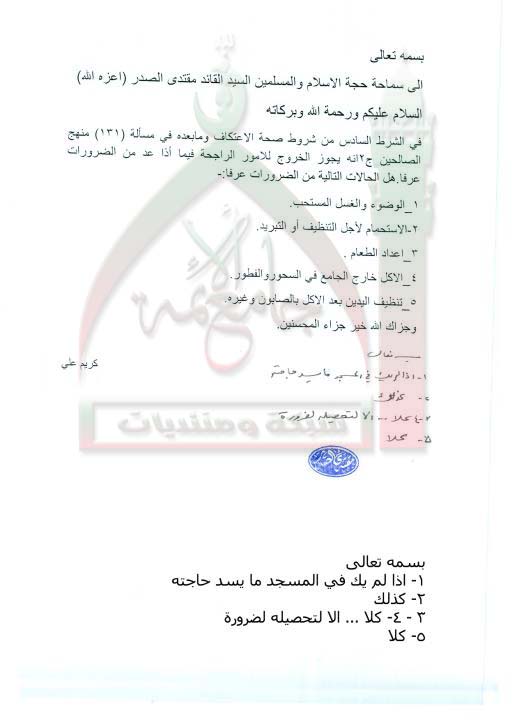 بعض موارد جواز الخروج من المسجد حين الاعتكاف(استفتاء للسيد القائد مقتدى الصدر اعزه الله بتاريخ12-8-2011)