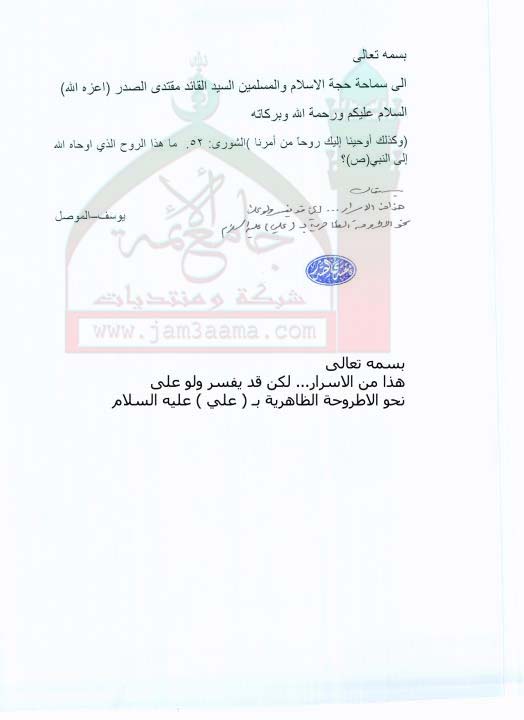 الروح الذي اوحاه الله الى النبي (ص)من الاسرار..لكن قد يفسر ولو على نحو الاطروحة الظاهرية ب(علي)عليه السلام(استفتاء للسيد القائد مقتدى الصدر اعزه الله بتاريخ12-8-2011)