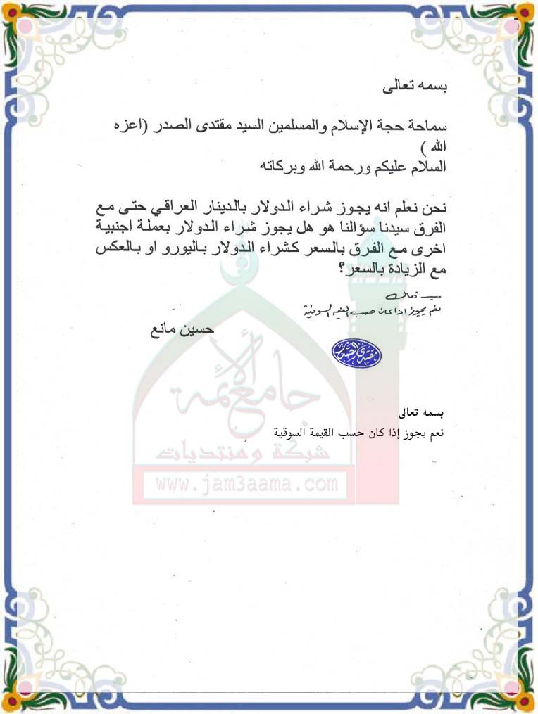 استفتاء للسيد القائد حول جواز شراء الدولار بالعملات الاجنبية الاخرى بتاريخ 13-12-2010