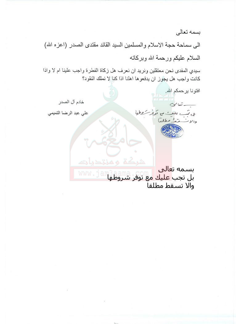 زكاة الفطرة تجب على المعتقلين مع توفر شروطها والا تسقط مطلقا(استفتاء للسيد القائد مقتدى الصدر اعزه الله بتاريخ12-8-2011)