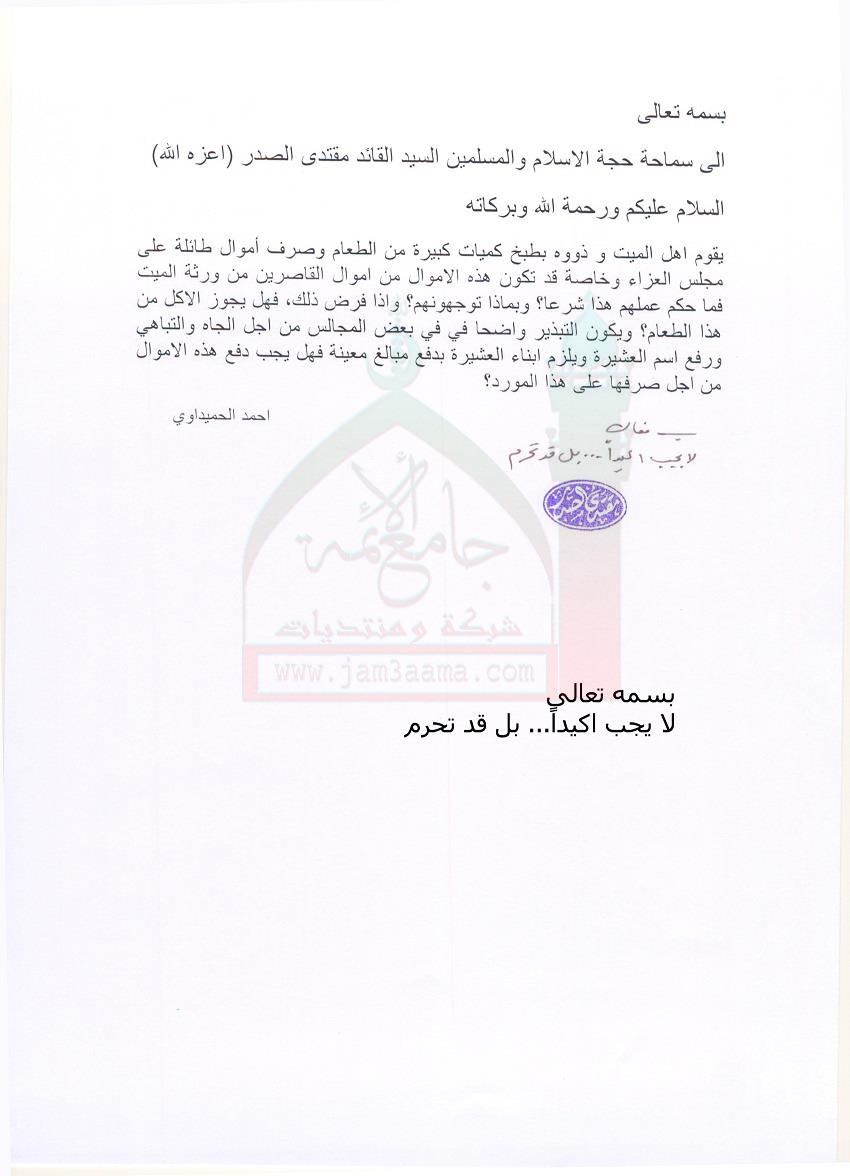 لا يجب دفع الاموال من قبل اقرباء الميت لعمل ولائم الطعام في مجالس العزاء بل قد تحرم (استفتاء للسيد القائد مقتدى الصدر اعزه الله بتاريخ 13-8-2011)