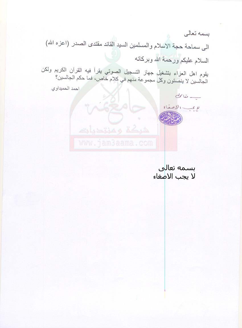 الاصغاء الى تلاوة القران الكريم في مجالس العزاء عبر جهاز التسجيل الصوتي غير واجب(استفتاء للسيد القائد مقتدى الصدر اعزه الله بتاريخ 13-8-2011)