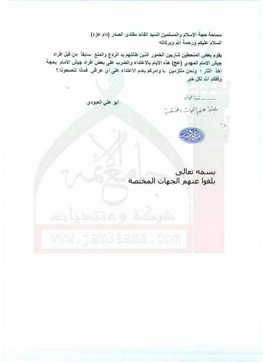 بلّغوا على من يعتدي عليكم لدى الجهات المختصة(استفتاء للسيد القائد مقتدى الصدر اعزه الله بتاريخ 14-8-2011)