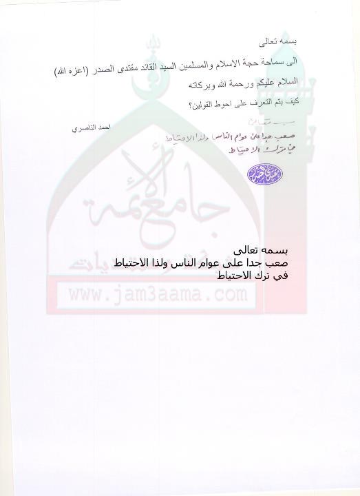التعرف على احوط القولين صعب جدا على عوام الناس لذا الاحتياط في ترك الاحتياط(استفتاء للسيد القائد مقتدى الصدر اعزه الله بتاريخ 15-8-2011)