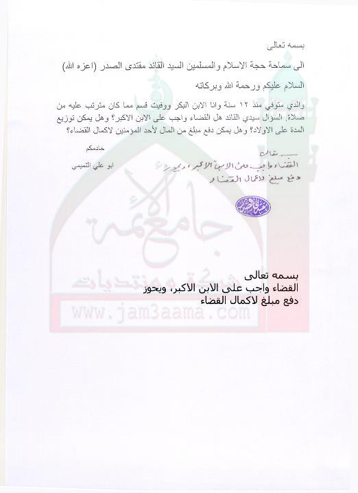 قضاء الصلاة عن الوالد المتوفى واجب على الابن الاكبر,ويجوز دفع مبلغ لاكمال القضاء(استفتاء للسيد القائد مقتدى الصدر اعزه الله بتاريخ 15-8-2011)