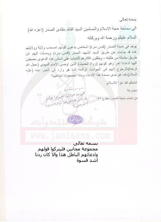 (مجموعة رواة الحديث في مدينة الصدر)مجموعة مجانين ,فليتركوا قولهم وادّعائهم الباطل هذا والا كان ردنا اشد قسوة(استفتاء للسيد القائد مقتدى الصدر اعزه الله بتاريخ 16-8-2011)