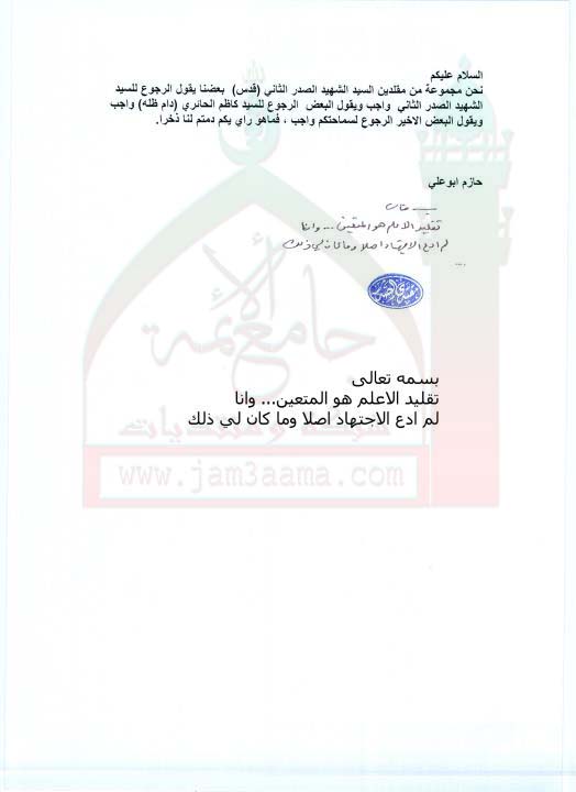 تقليد الاعلم هو المتعين... وانا لم ادّع الاجتهاد اصلا وما كان لي ذلك(استفتاء للسيد القائد مقتدى الصدر اعزه الله بتاريخ17-8-2011)