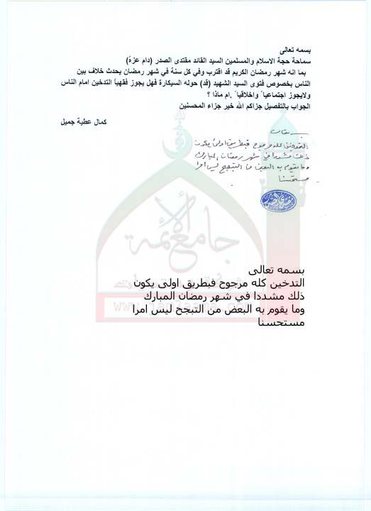 التدخين كله مرجوح, فبطريق اولى يكون ذلك مشددا في شهر رمضان (استفتاء للسيد القائد مقتدى الصدر اعزه الله بتاريخ17-8-2011)