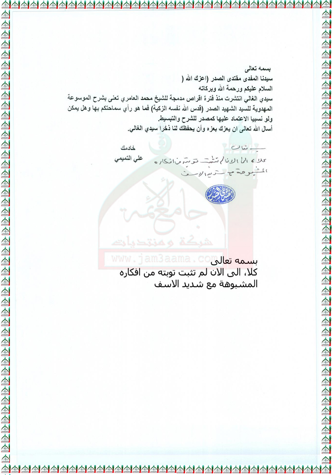لم تثبت توبة الشيخ محمد العامري من افكاره المشبوهه استفتاء السيد القائد مقتدى الصدر اعزه الله 20-8-2011