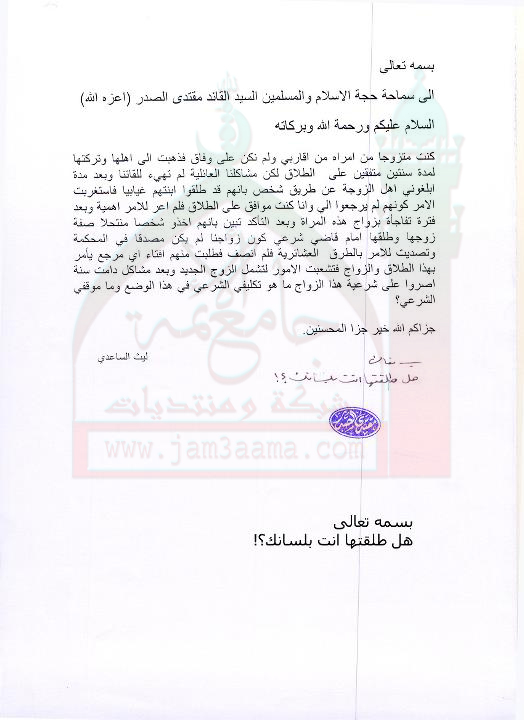 الطلاق من شروطه تطليق الزوج لزوجته بلسانه ( استفتاء للسيد القائد مقتدى الصدر اعزه الله بتاريخ 21-8-2011)