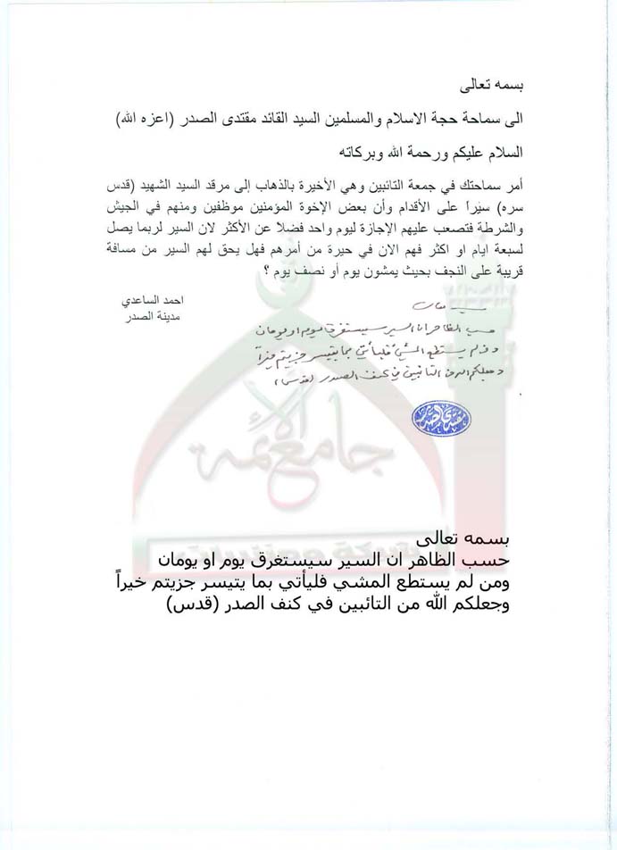 من لم يستطع المشي في جمعة التائبين فلياتي بما يتيسر ( استفتاء للسيد القائد مقتدى الصدر اعزه الله بتاريخ 23-8-2011)