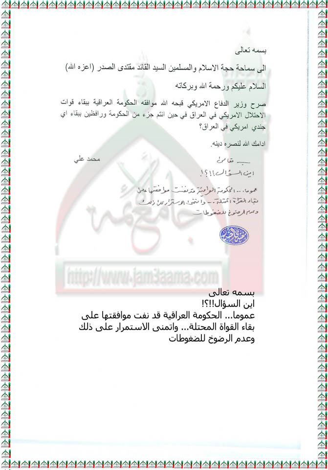 تصريح وزير دفاع الاحتلال بموافقة الحكومة العراقية على بقاء قوات الاحتلال ( استفتاء للسيد القائد مقتدى الصدر اعزه الله بتاريخ 23-8-2011)