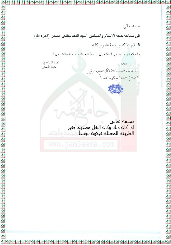 أذا كان الخل المضاف الى شراب السكنجبيل مصنوعا بغير الطريقة المحللة فيكون السكنجبيل نجسا ( استفتاء للسيد القائد مقتدى الصدر اعزه الله بتاريخ 23-8-2011)