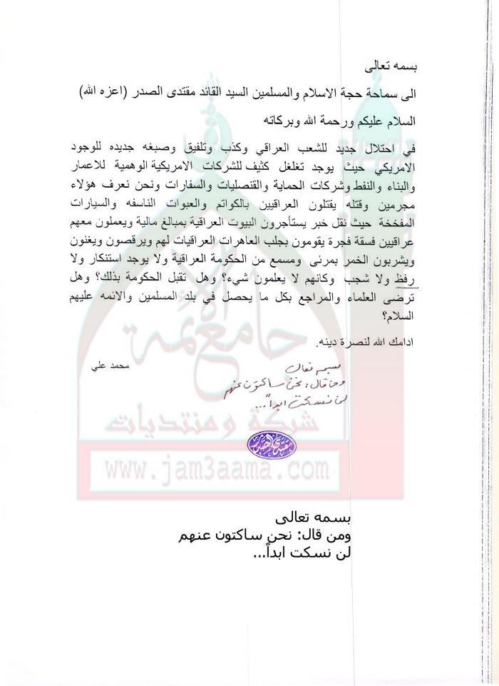 شركات الاحتلال الامريكي ..من قال :نحن ساكتون عنهم,لن نسكت ابدا ( استفتاء للسيد القائد مقتدى الصدر اعزه الله بتاريخ 23-8-2011)