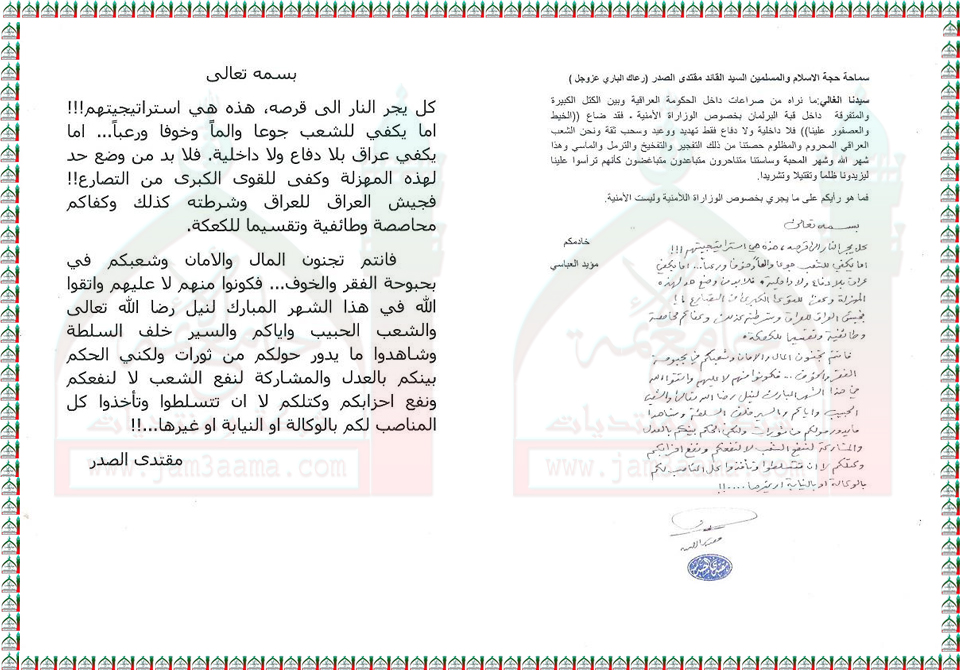 اما يكفي عراق بلا دفاع ولا داخلية,فلا بد من وضع حد لهذه المهزلة وكفى للقوى الكبرى من التصارع!! ( استفتاء للسيد القائد مقتدى الصدر اعزه الله بتاريخ 23-8-2011)
