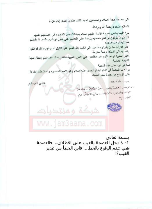 لادخل للعصمة بالعلم بالغيب على الاطلاق...فالعصمة هي عدم الوقوع بالخطا ( استفتاء للسيد القائد مقتدى الصدر اعزه الله بتاريخ 24-8-2011)
