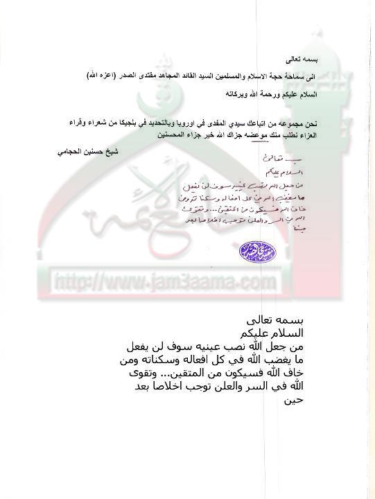 موعظة لجمع من المؤمنين في بلجيكا ( استفتاء للسيد القائد مقتدى الصدر اعزه الله بتاريخ 26-8-2011)