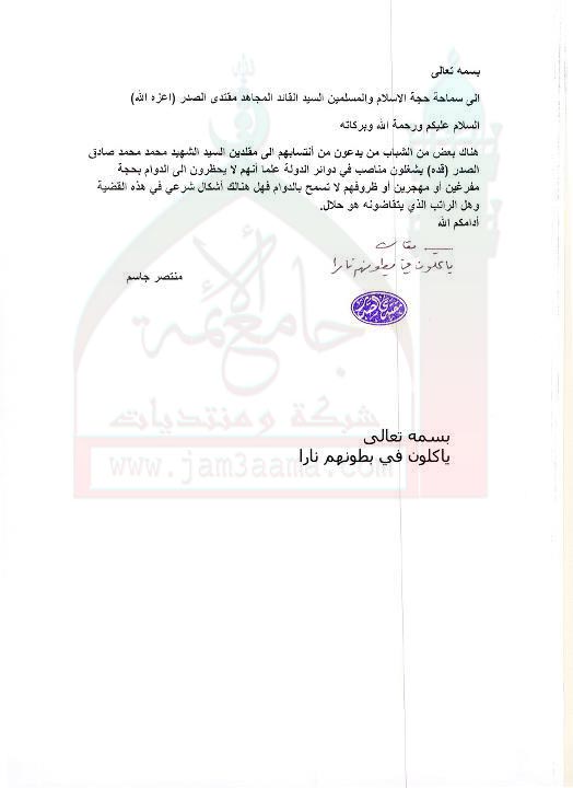 حكم راتب الموظف مع تسيبه بالدوام ( استفتاء للسيد القائد مقتدى الصدر اعزه الله بتاريخ 26-8-2011)
