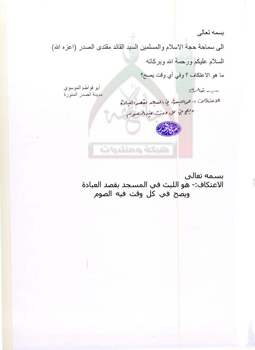 الاعتكاف هو اللبث في المسجد بقصد العبادة ( استفتاء للسيد القائد مقتدى الصدر بتاريخ 27-8-2011)