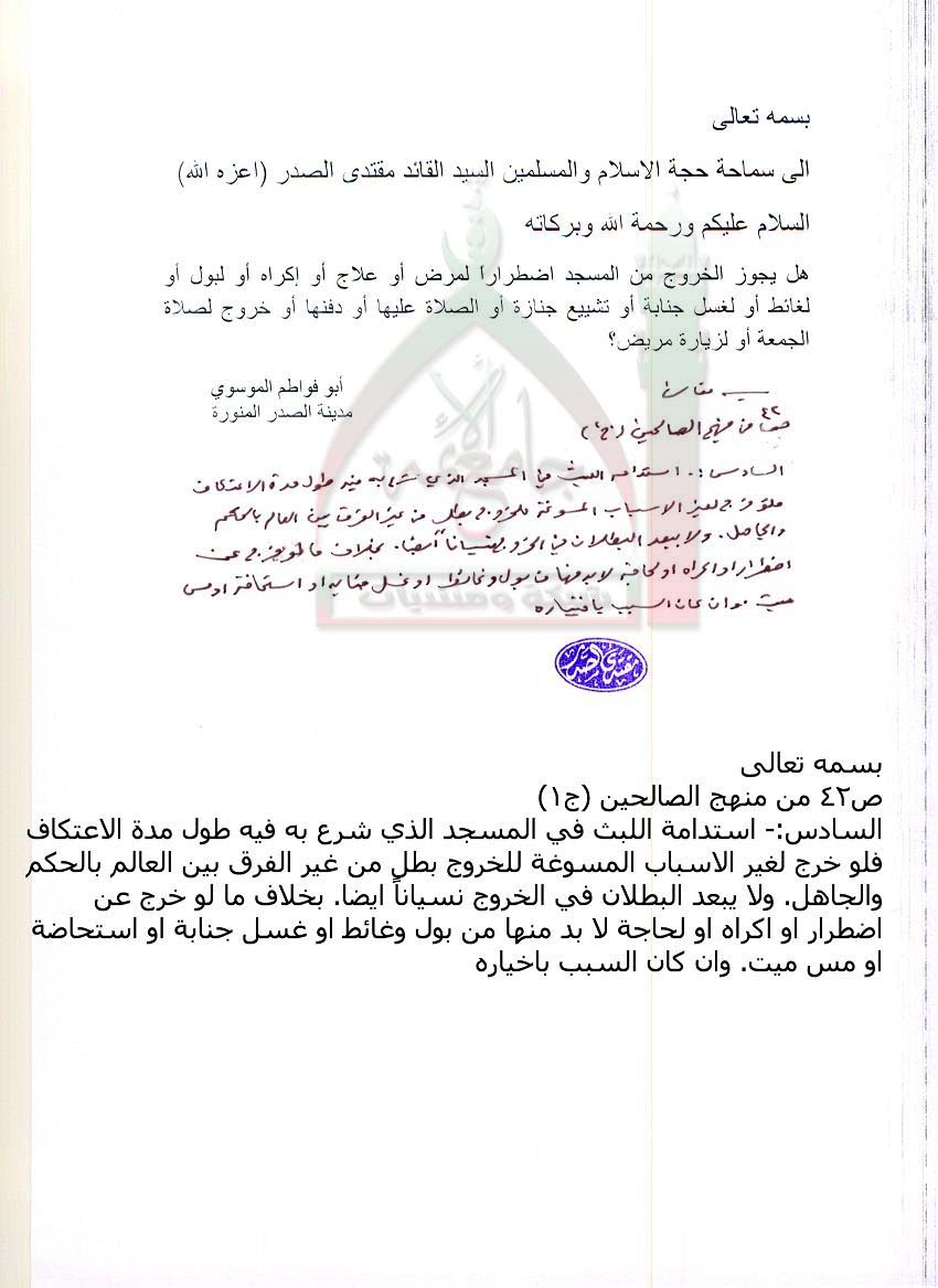 حكم الخروج من المسجد اضطرارا للمعتكف ( استفتاء للسيد القائد مقتدى الصدر اعزه الله بتاريخ 27-8-2011)