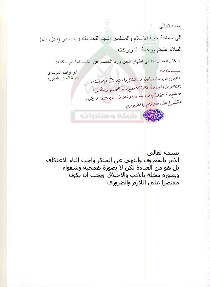 الامر بالمعروف والنهي عن المنكر واجب اثناء الاعتكاف ( استفتاء للسيد القائد مقتدى الصدر اعزه الله بتاريخ 27-8-2011)