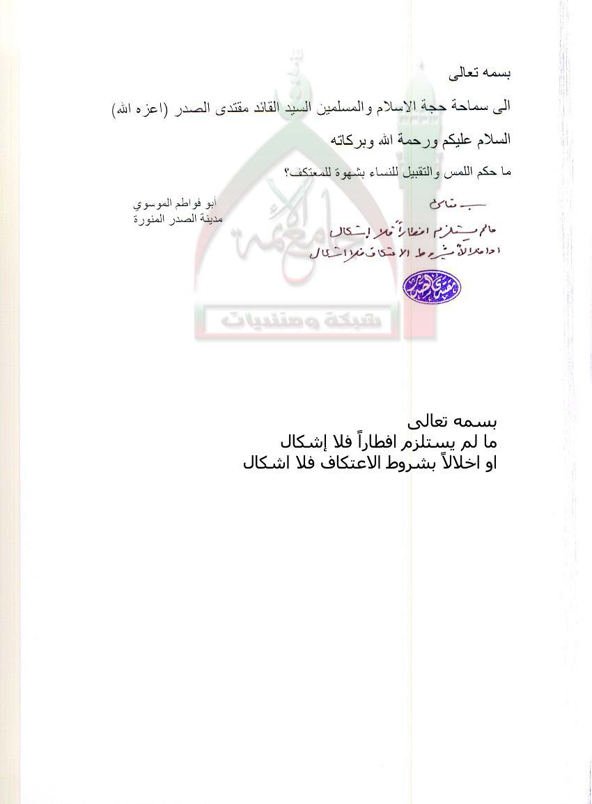 حكم اللمس والتقبيل للنساء بشهوة للمعتكف ( استفتاء للسيد القائد مقتدى الصدر اعزه الله بتاريخ 27-8-2011)