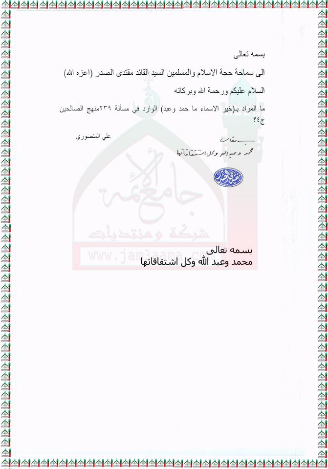 خير الاسماء محمد وعبد الله واشتقاقاتهما ( استفتاء للسيد القائد مقتدى الصدر اعزه الله بتاريخ 28-8-2011)