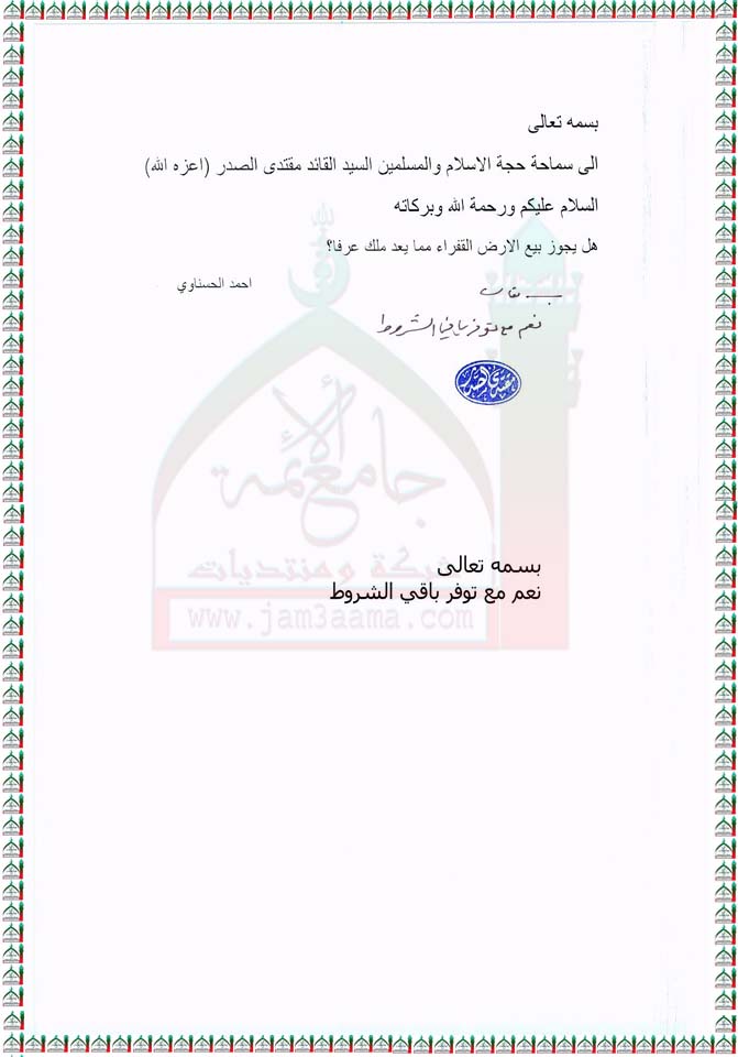 بيع الارض القفراء ( استفتاء للسيد القائد مقتدى الصدر اعزه الله بتاريخ 28-8-2011)