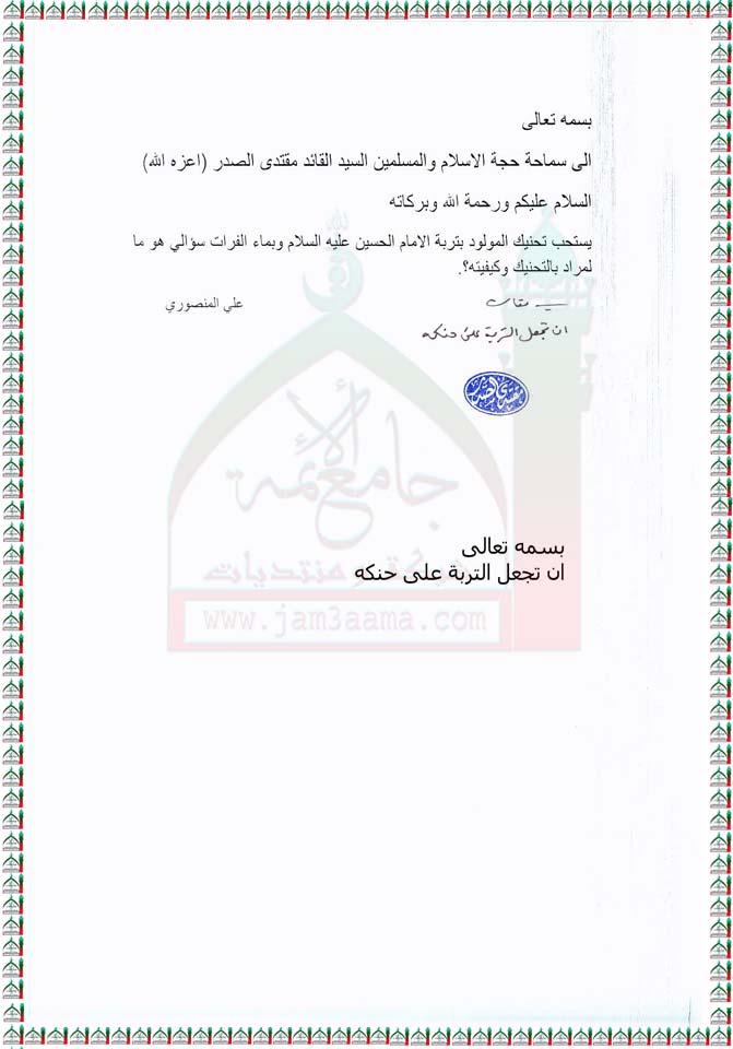 تحنيك المولود معناه وضع التربة الحسينية على حنكه ( استفتاء للسيد القائد مقتدى الصدر اعزه الله بتاريخ 28-8-2011)