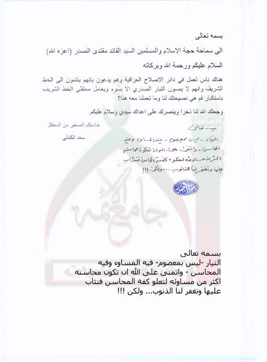 التيار-ليس بمعصوم-فيه المساؤى وفيه المحاسن- (استفتاء للسيد القائد مقتدى الصدر اعزه الله بتاريخ 29-8-2011)