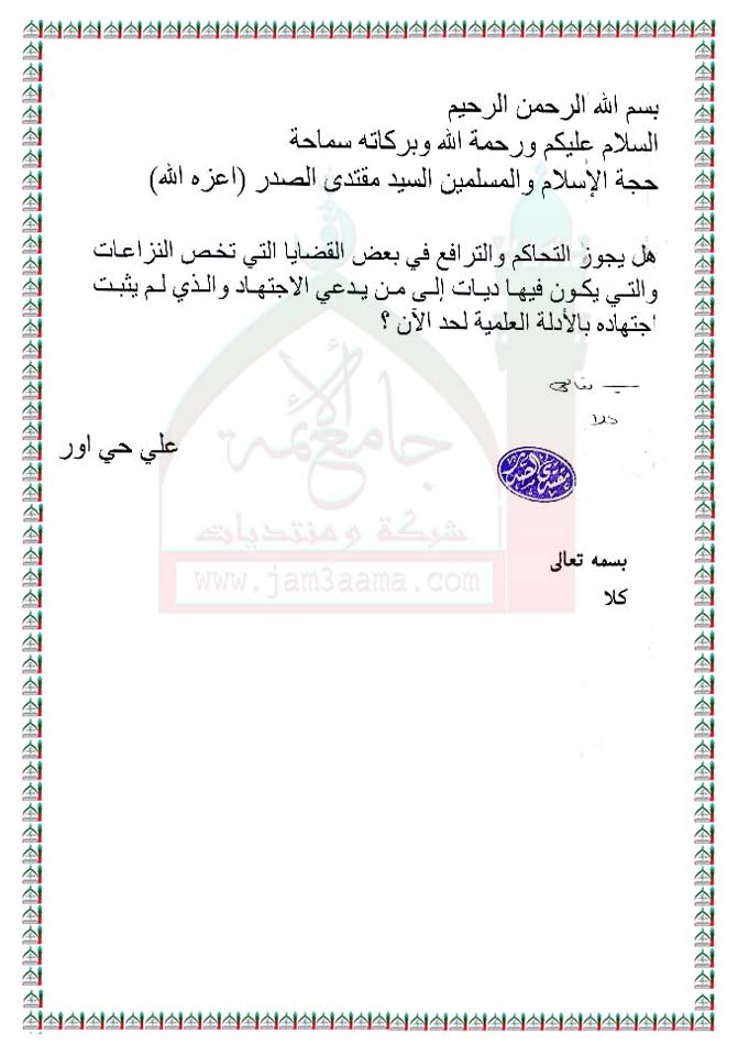 سؤال حول الديات ( استفتاء للسيد القائد مقتدى الصدر اعزه الله بتاريخ 30-8-2011)