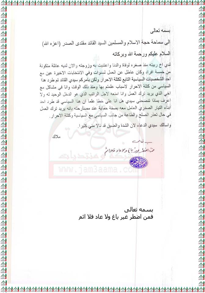 مشكلة لاحد المواطنين ( استفتاء للسيد القائد مقتدى الصدر اعزه الله بتاريخ 30-8-2011 )