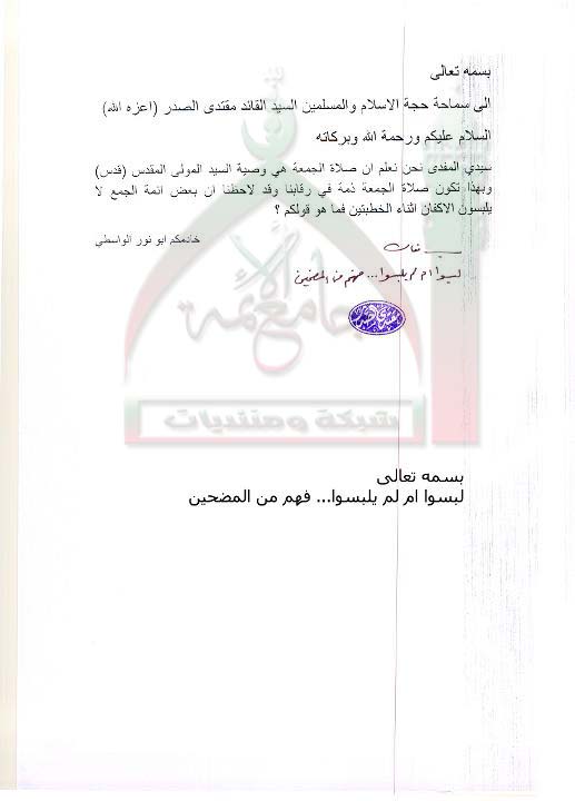 ائمة الجمعة لبسوا الاكفان ام لم يلبسوا ...فهم من المضحين ( استفتاء للسيد القائد مقتدى الصدر اعزه الله بتاريخ 30-8-2011 )