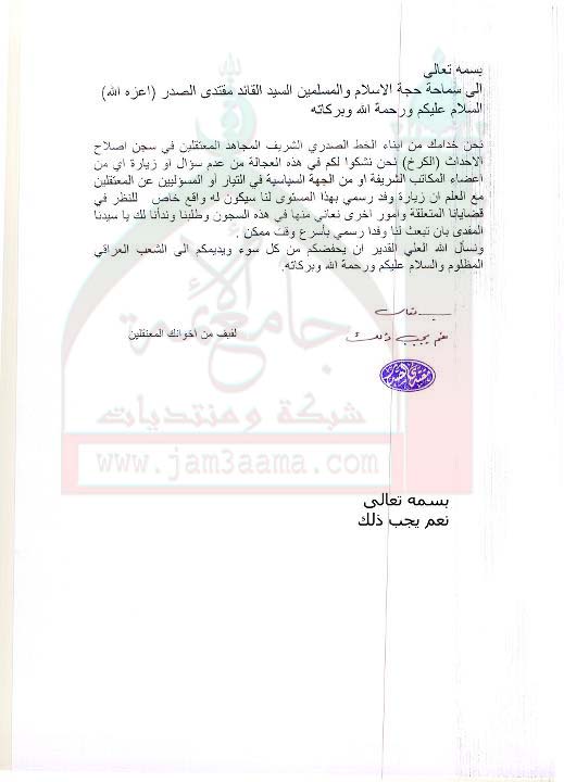 زيارة وفد من مكتب السيد الشهيد للمعتقلين ( استفتاء للسيد القائد مقتدى الصدر اعزه الله بتاريخ 30-8-2011 )