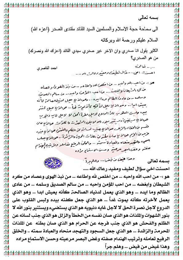 من هو الصدري ( استفتاء للسيد القائد مقتدى الصدر اعزه الله بتاريخ 31-8-2011 )