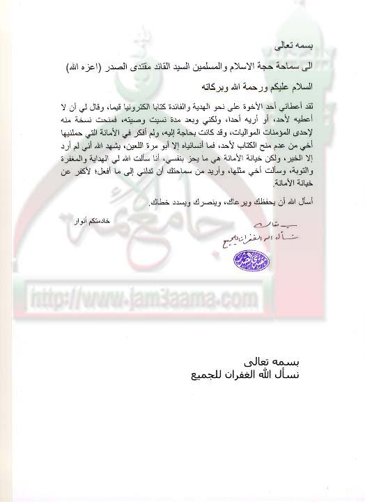 التفريط في الامانة ( استفتاء للسيد القائد مقتدى الصدر اعزه الله بتاريخ 31-8-2011 )