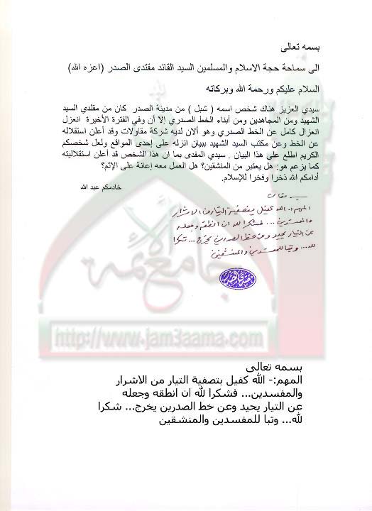خروج المنشقين والمفسدين من التيار - شبل - ( استفتاء للسيد القائد مقتدى الصدر اعزه الله بتاريخ 31-8-2011 )