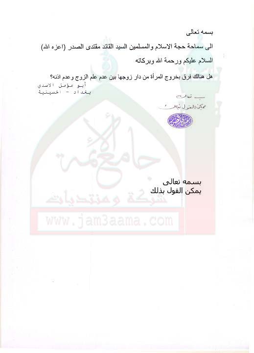 هنالك فرق بخروج المراة من دار زوجها بين عدم علم الزوج وعدم اذنه (استفتاء للسيد القائد مقتدى الصدر اعزه الله بتاريخ 5-9-2011)